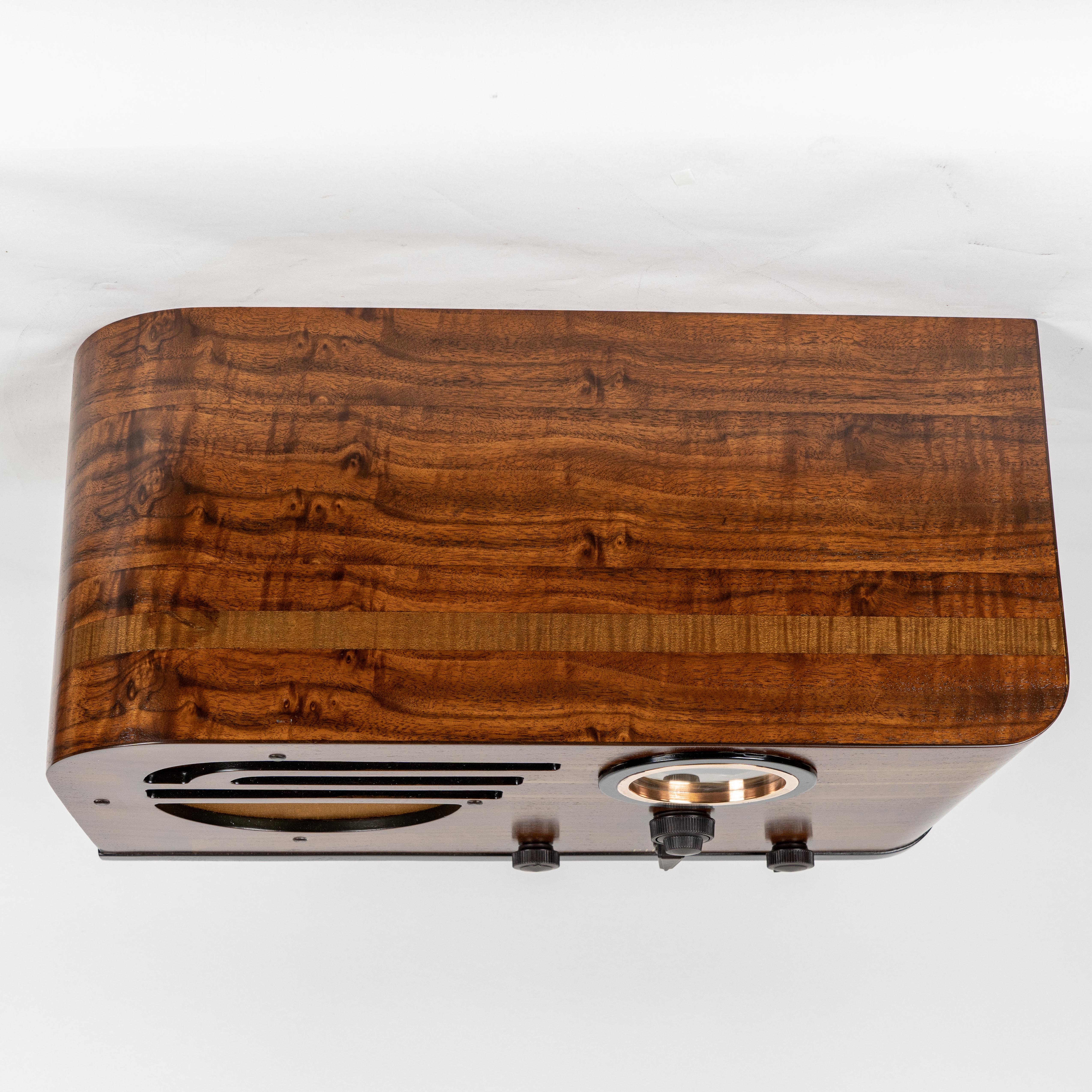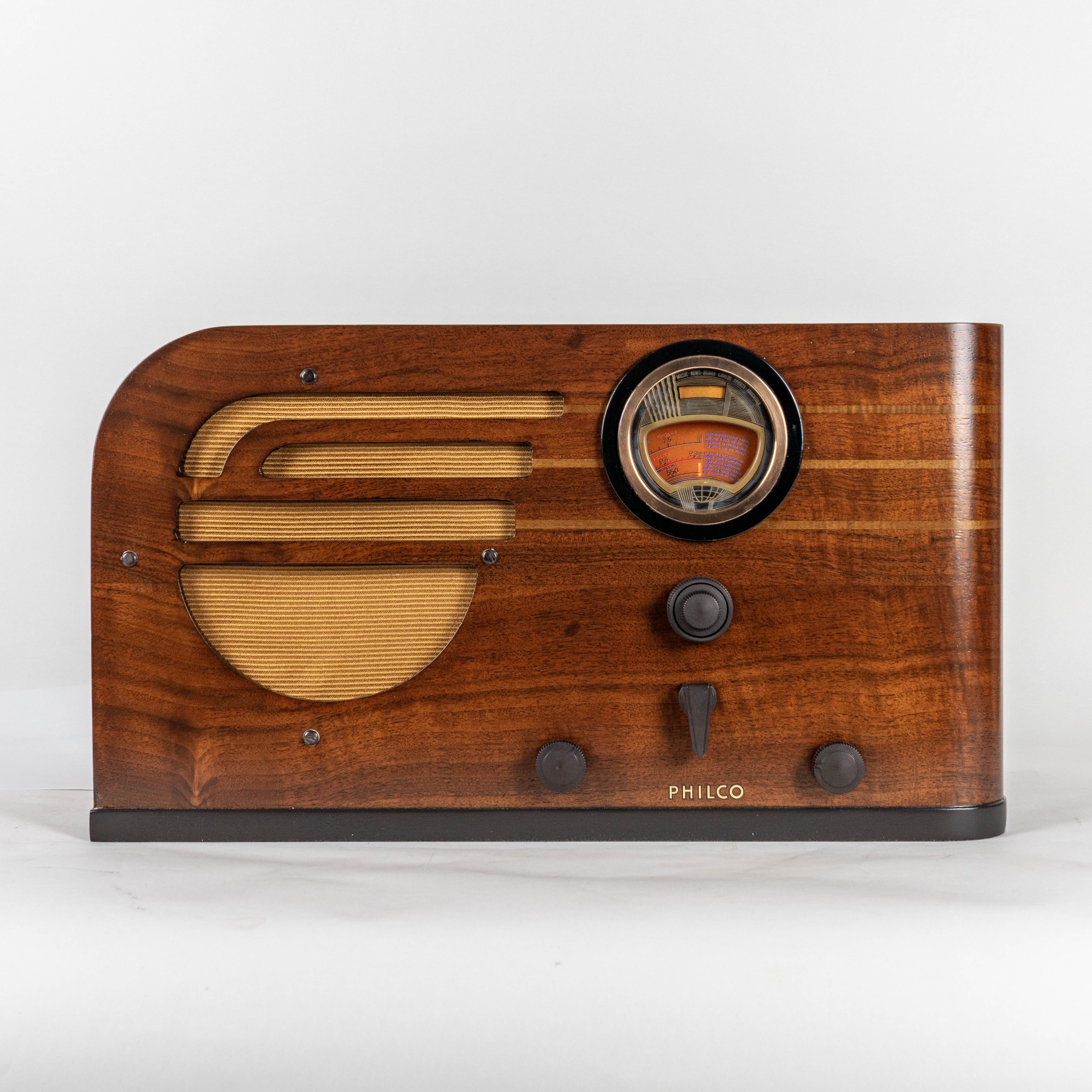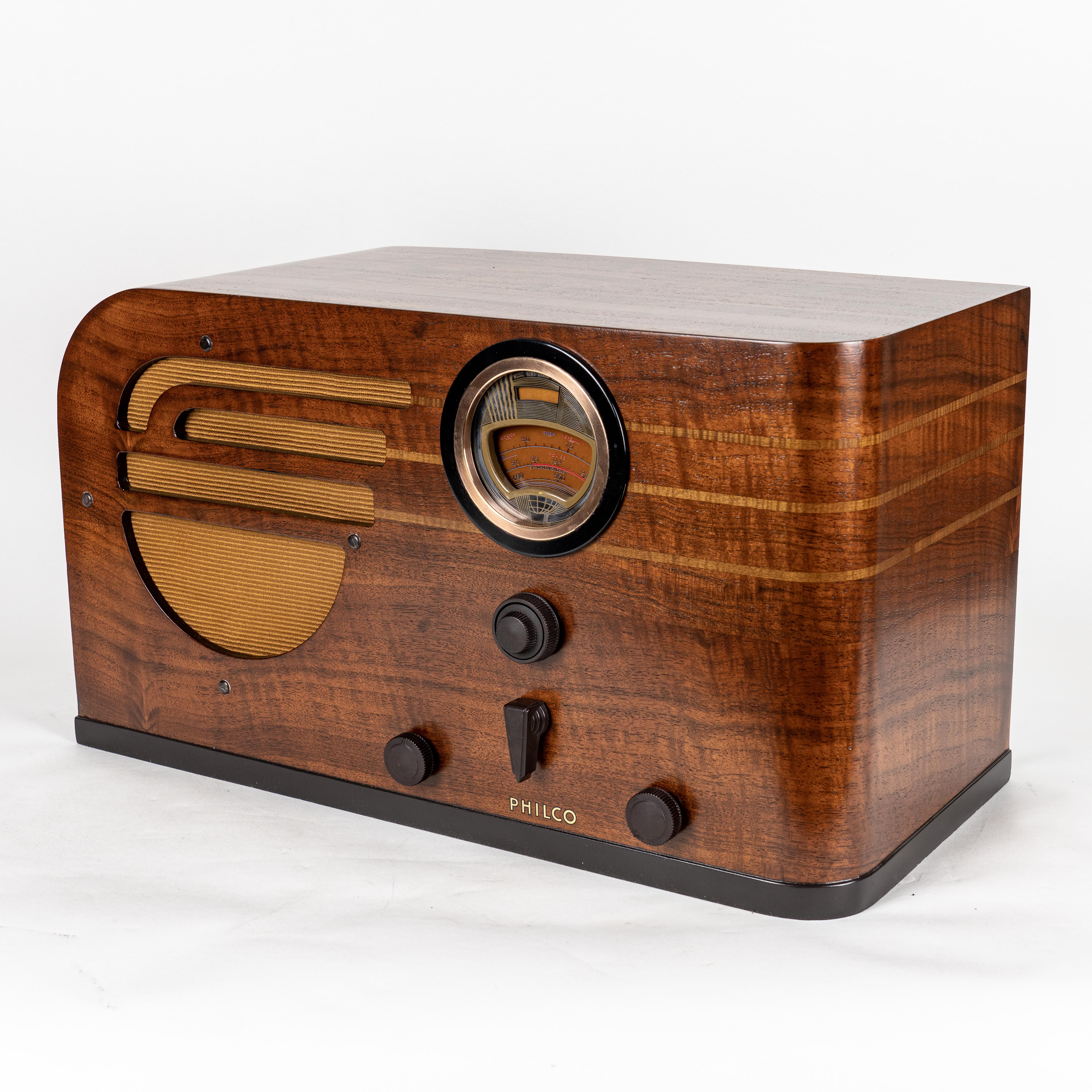 This gorgeous Art Deco radio is the 1937 Philco 37-630T. It has a premium grade six tube, 3-Watt output chassis, and it is an incredible performer. The radio picks up stations with the simplest antenna and the wood cabinet gives everything you play a deep, rich sound.