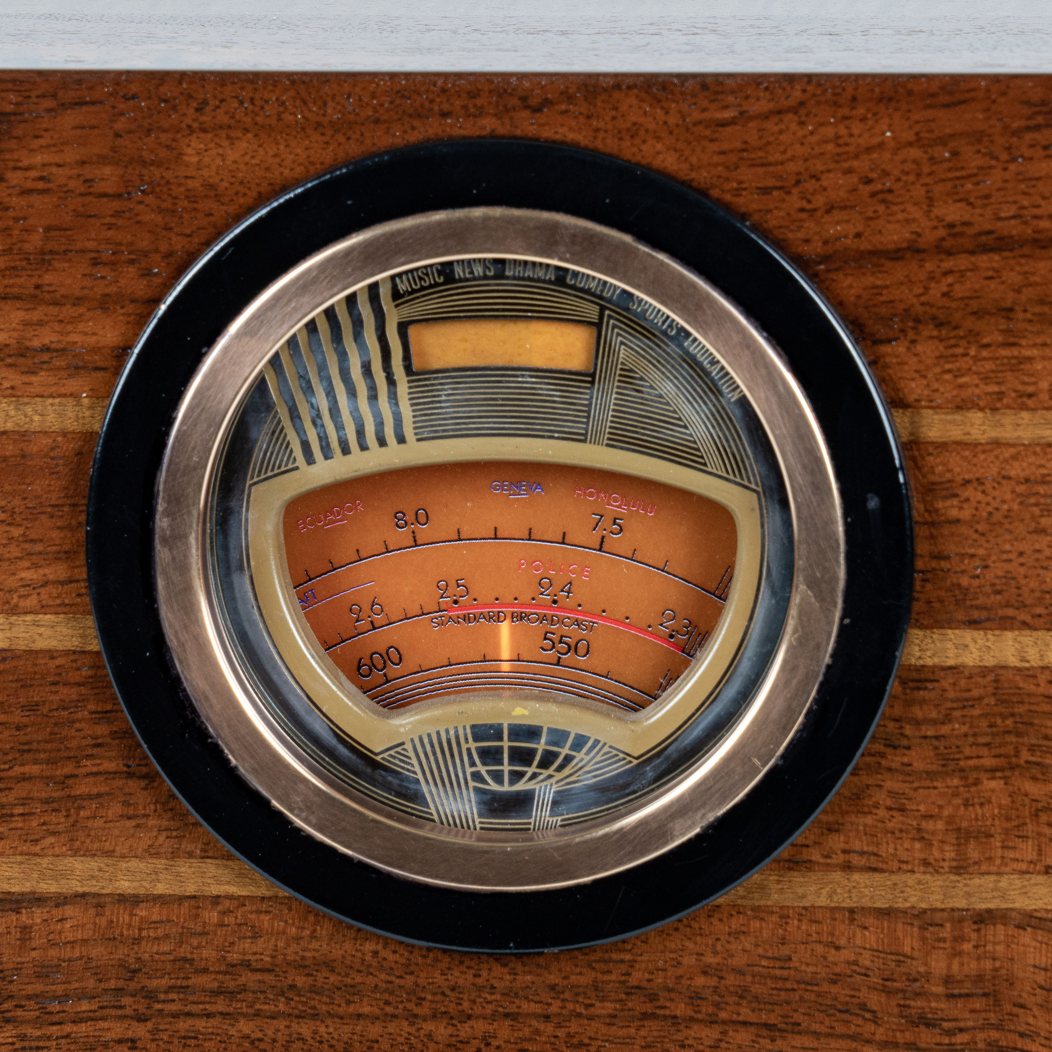 Dial – The very stylish Art Deco Globe dial is quite an impressive sight - especially in a dim or dark room. The dial exhibits the broadcast scale at the bottom and two consecutive shortwave bands on top. As you select a band the ‘Glow Beam Indicator’ lights up the band and the frequency you tune. The letters and number are very legible because the faceplate is a brand-new reproduction of the original. The Glow Beam Indicator light shields are original. This model includes the Shadow Meter which narrows to indicates the center of a station’s frequency. The cabinet dial glass and free & clear of any chips, breaks or cracks. The surrounding brass escutcheon has been stripped and refinished to keep its like-new look well into the future.