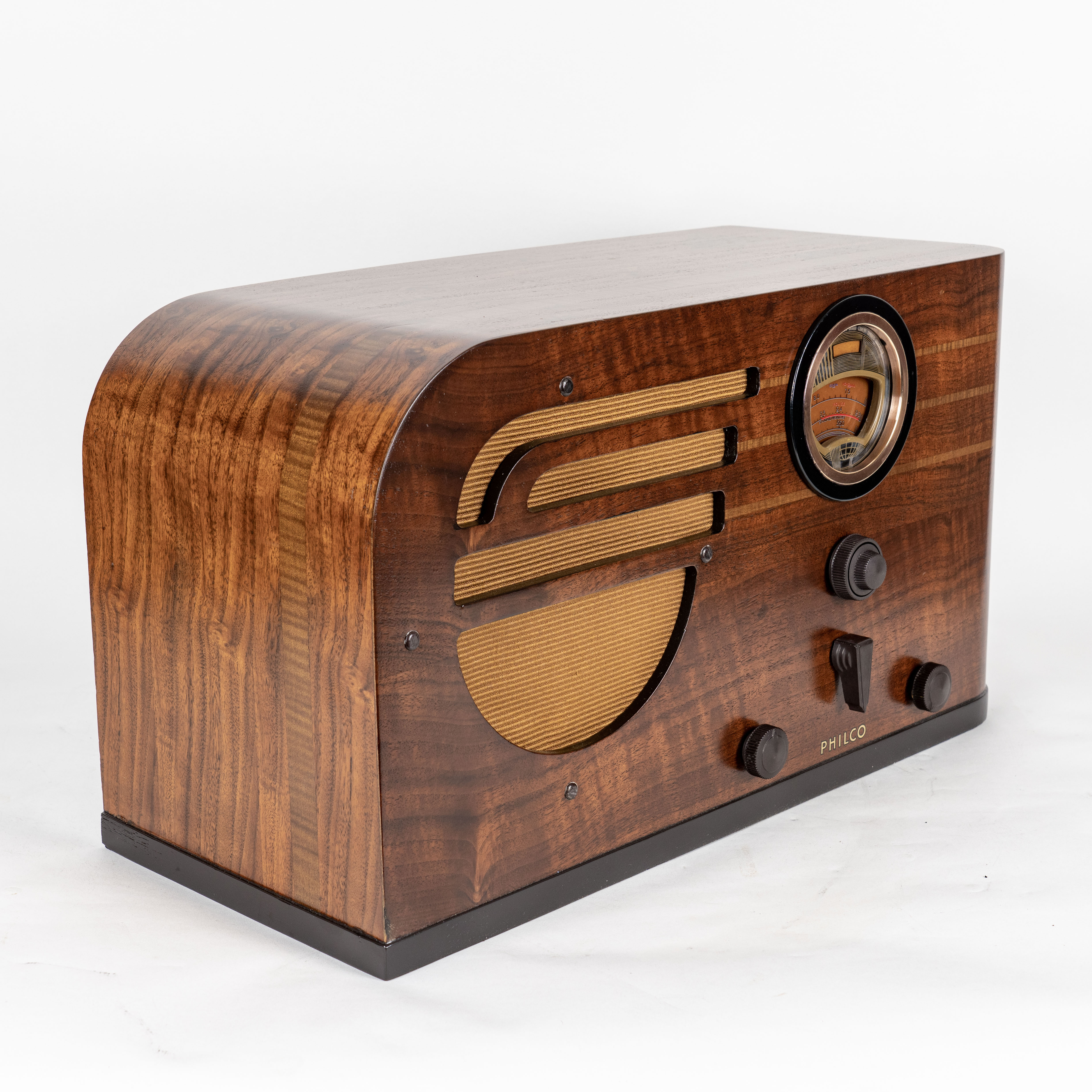 Cabinet – The cabinet got a complete restoration. We stripped the original shellac and, toned the top piping pin stripes and footer and the entire cabinet sealed with a flat matte lacquer. We made the original multi-colored veneers pop. We fixed a small abrasion in the lower left corner that is now barely noticeable. We added an exact match Philco reproduction grille cloth and retained the original control knobs. The knobs, from left to right, are on/off/three-point tone control, band switch (center), fine/coarse tuning (upper middle) and volume (right). The result is this handsome looking radio that will last many, many years into the future.