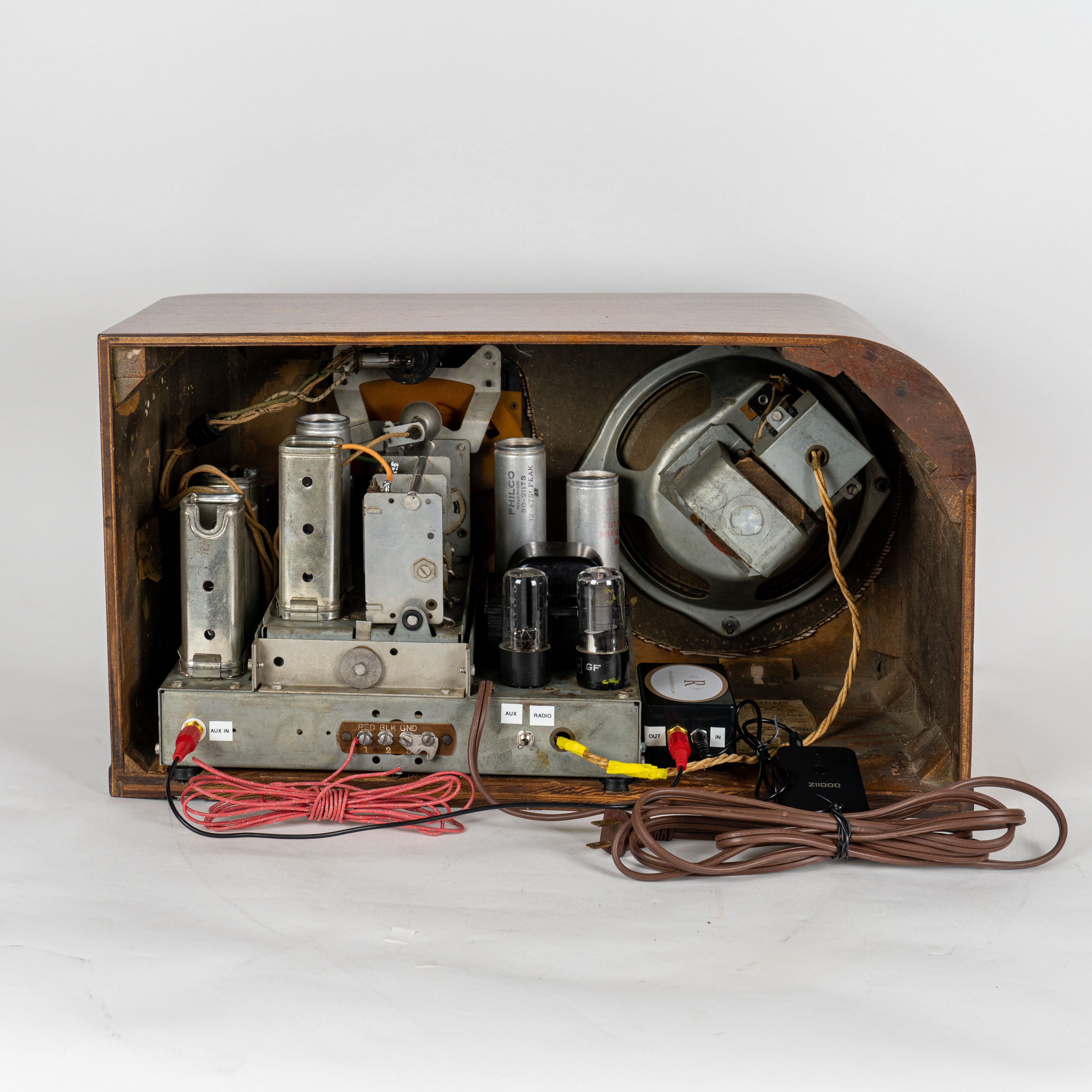 Chassis – We took extra steps and worked with the top expert at the California Historical Radio Society to ensure this radio produces no hum. For its age there was no damage and only minimal, small spots of rust on the chassis. We cleaned the steel chassis exterior and added rust inhibitor or paint to stop future corrosion. We went through the entire underside of the chassis replacing all the capacitors, checking, and replacing resistors and wires where needed. It now plays very well across the dial and all bands even with the simplest of antennas. All tubes were checked and replaced where needed with NOS (new old stock) tubes. We disassembled and lubricated the main tuning capacitor gears and concentric tuning mechanism for smooth tuning operation. A new power cord was installed for electrical safety and new silicone rubber chassis mounts were added for better vibration isolation. We added an Auxiliary input and switch on the back and aligned the radio for the Bluetooth adapter.